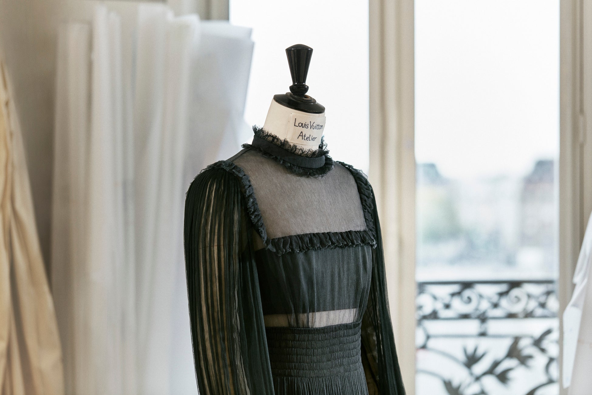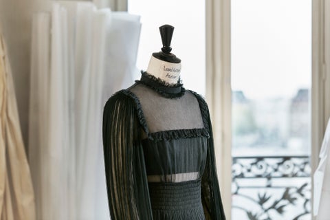 - ドレスにはスモックのディテールやマイクロフリルが施されており、50メートル以上の生地を使用して制作された