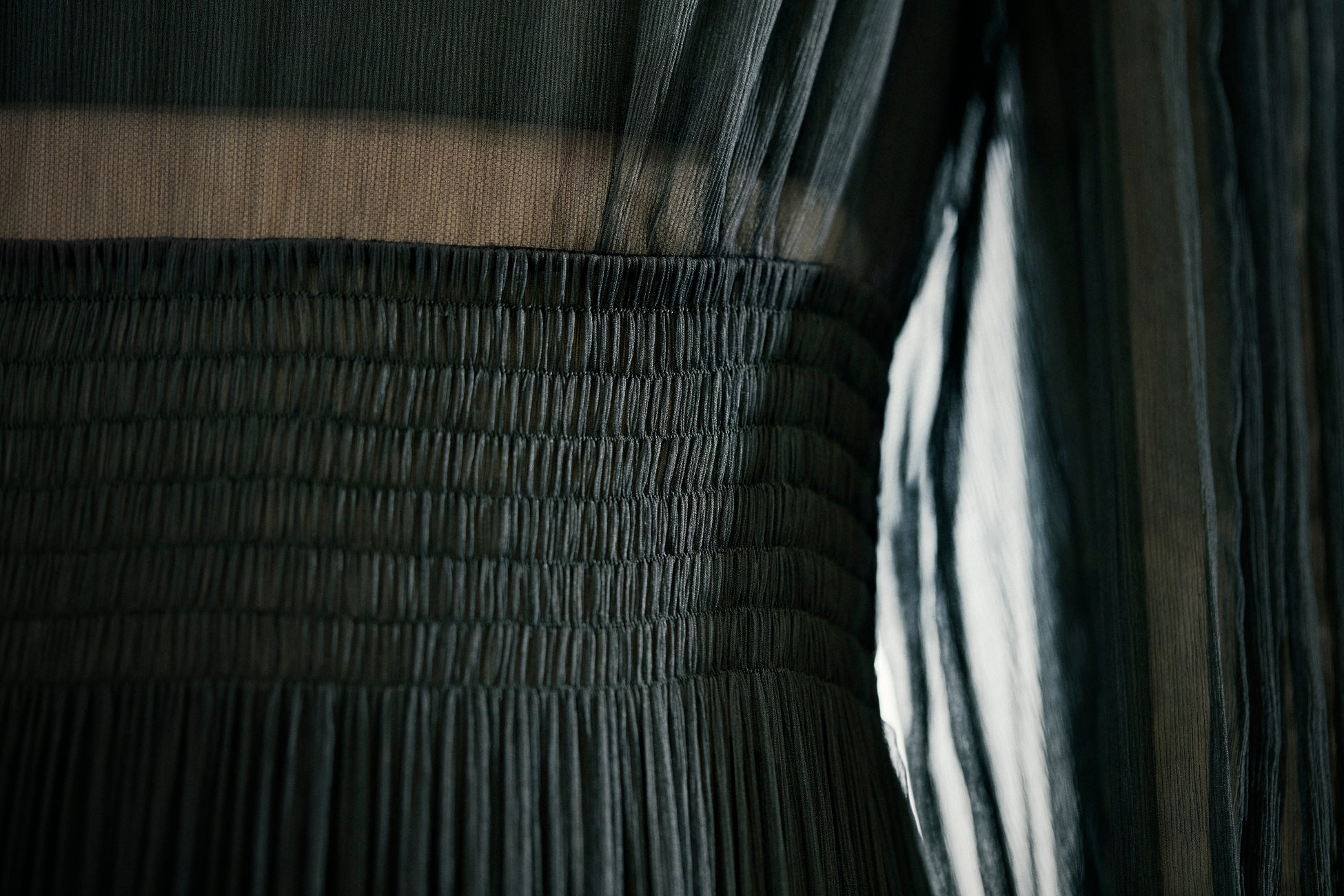 このドレスはウエスト周りとバックトレーンにスモックのディテールが施され、スカートにはマイクロフリルが重ね合わされたデザインとなっています。