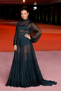 アリシア・ヴィキャンデルは、2023年にロサンゼルスで開催された「アカデミー映画博物館ガラ」で、ルイ・ヴィトンの特注のダークグレーグリーンシルククレポンシフォンのロングスリーブドレスを着用しました。