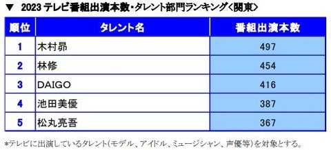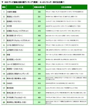 ニホンモニター 2023タレント<関東・関西>番組出演本数ランキング