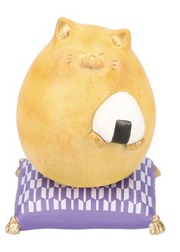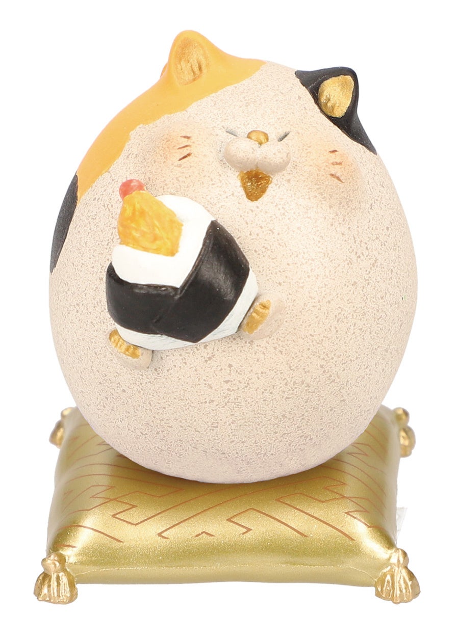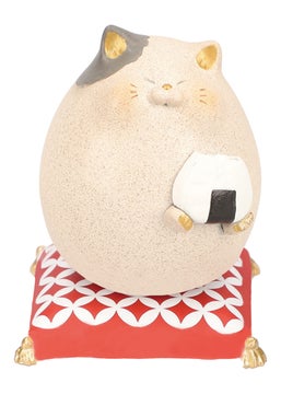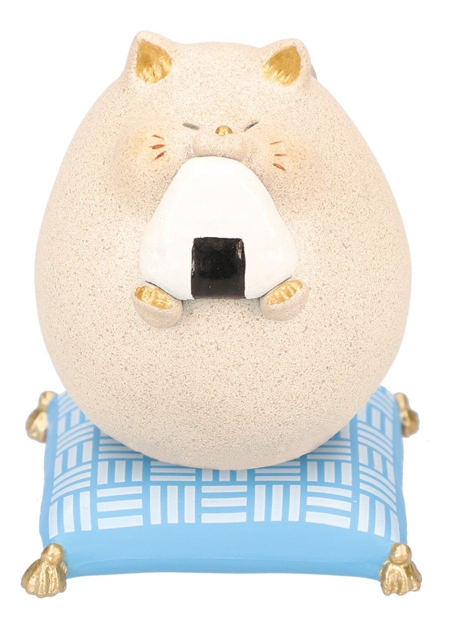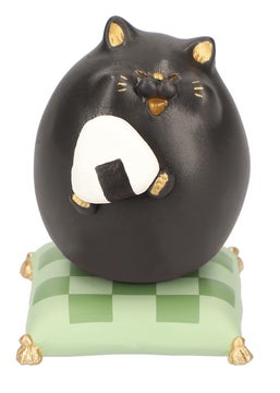 ふっくらとしたほっぺや丸い体でおにぎりを食べるねこさんは、手のひらサイズながらも丁寧な造形と繊細な彩色が施されています。