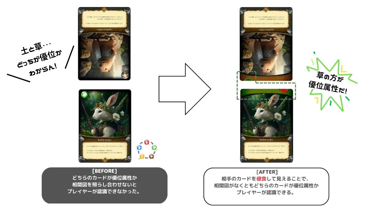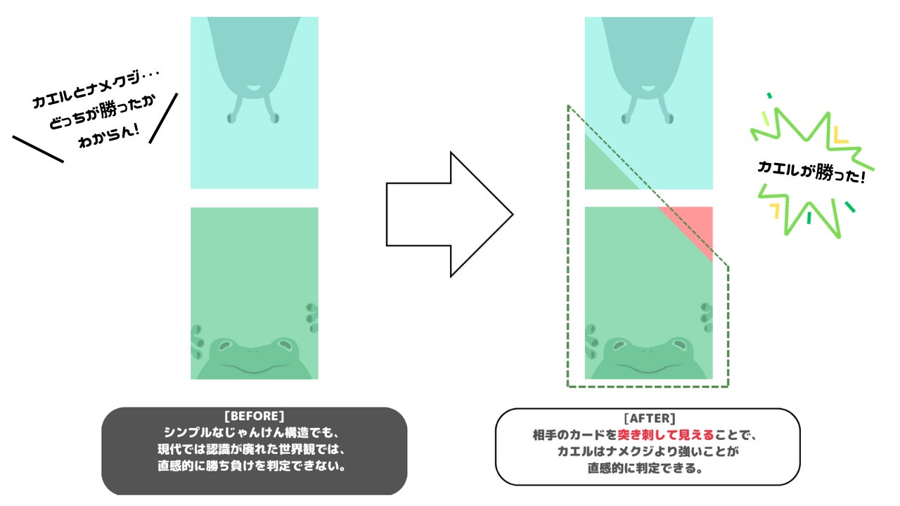 従来の石・ハサミ・紙や火・水・森などのモチーフを使わずに、力関係を表現することができます。