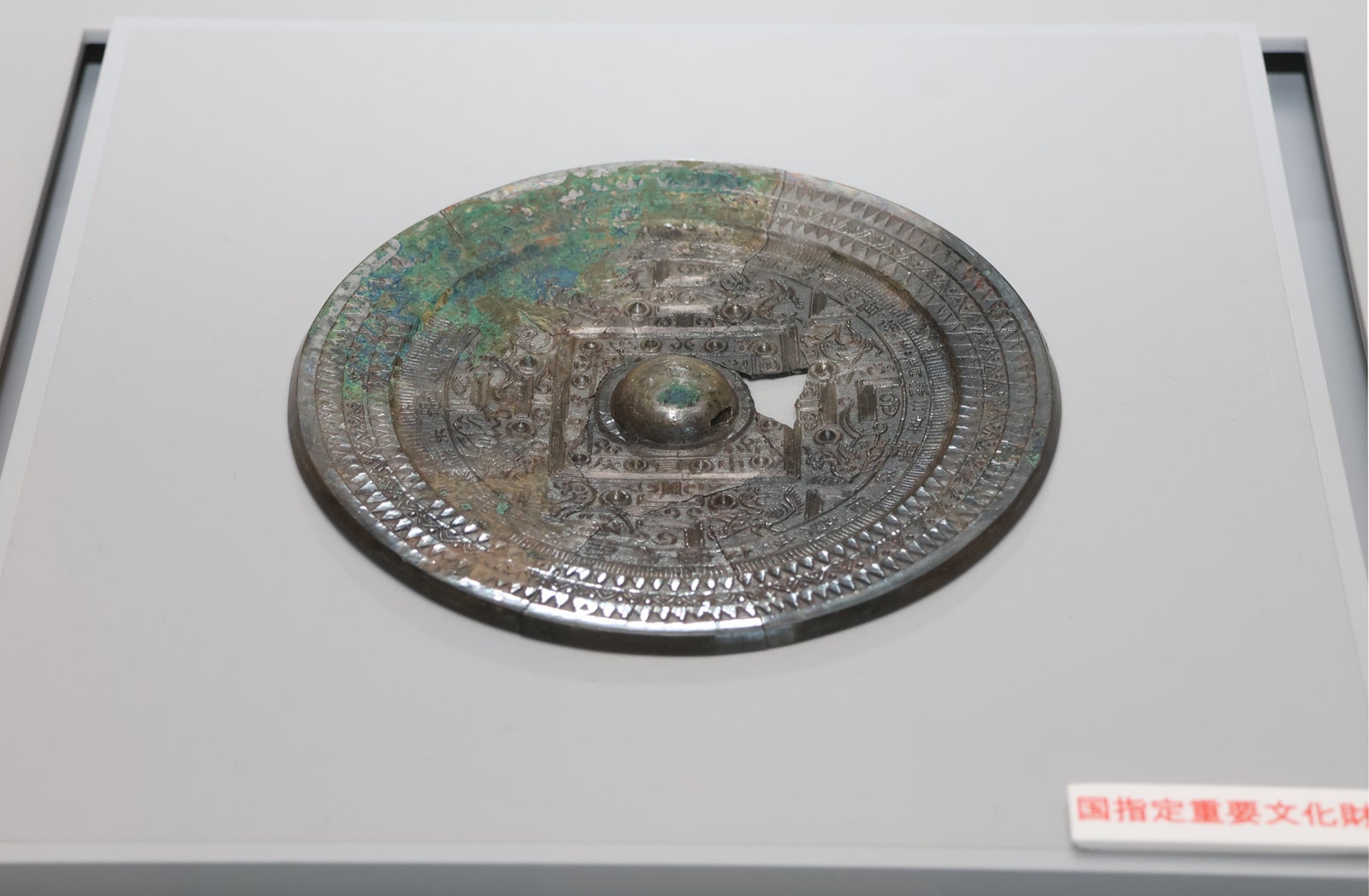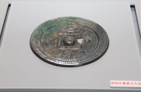 - 安満宮山古墳から出土した「青龍三年」銘方格規矩四神鏡が展示されている