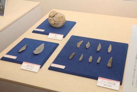 - 郡家今城遺跡から出土した石器や翼状剥片も展示されている