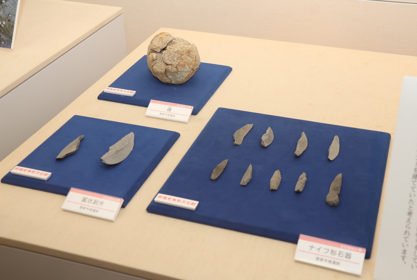 また、旧石器時代の遺跡である郡家今城遺跡から出土した石器や翼状剥片も展示されています。