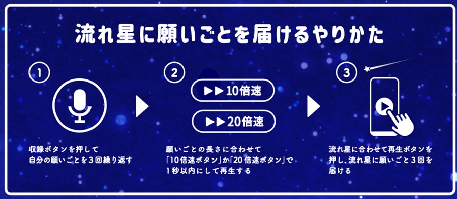 このサービスでは、願いごとを1秒以内で高速再生し、流れ星に届けます。