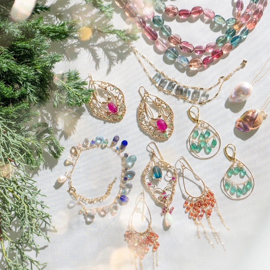 注目アイテムとしては、アナムジェムズの1/1000の虹色パールネックレスやLily Meiのルビーピアス、DRAGEE JEWELRYの天然石マルチブレスレットなどがあります。