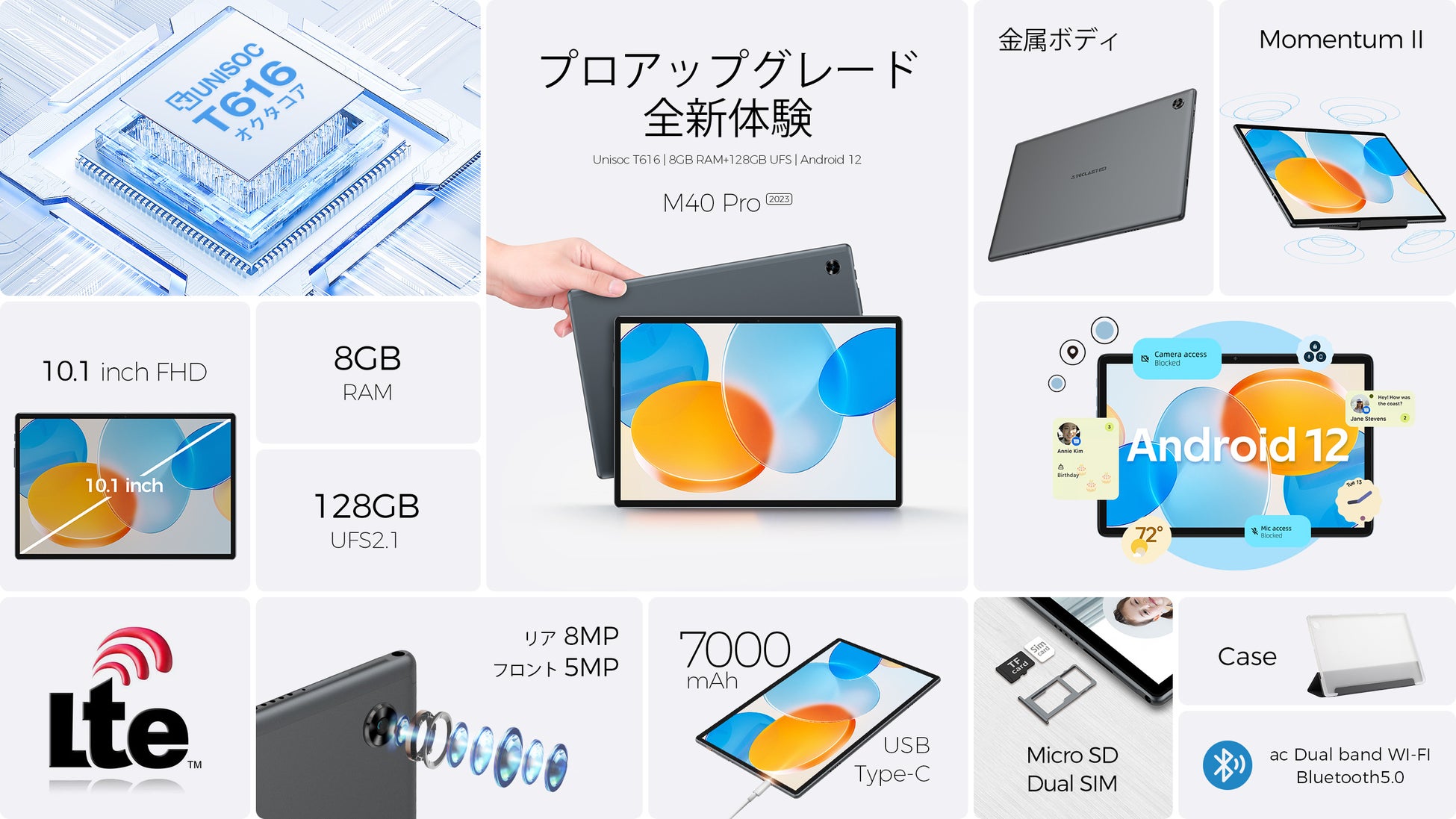 M40Proは、UNISOC Tiger T616プロセスを使用しており、Android 12を搭載し、10.1インチIPS FHDスクリーン、8GBのLPDDR4 RAM、7000mAhバッテリー、デュアルSIM /Micro SDスロット、TD-LTEおよびFDD-LTE 4Gネットワークのサポートなどを備えている。