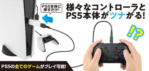 このアダプタを使用すると、PS4用コントローラやSWITCH Proコントローラなど、さまざまなコントローラでPS5の全てのゲームをプレイすることができます。