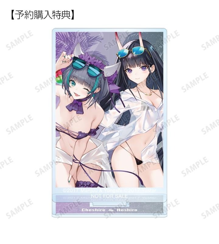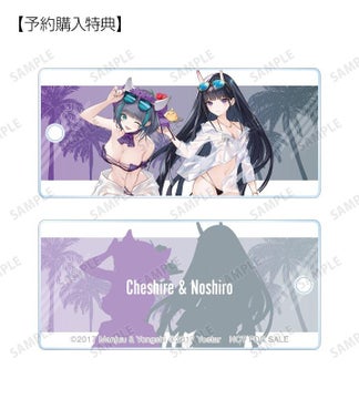 さらに、予約購入特典として「描き起こしイラスト チェシャー&能代 水着ver. アクリルスタンド AMNIBUS限定特典」や「描き起こしイラスト チェシャー&能代 水着ver. アクリルキータグ AMNIBUS限定特典」が付属します。