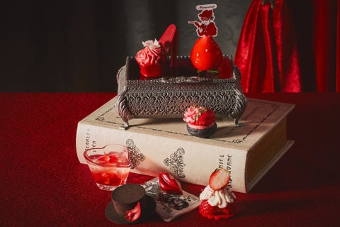 ティースタンドには、仮面舞踏会の貴族をイメージしたスイーツ7種類が並びます。