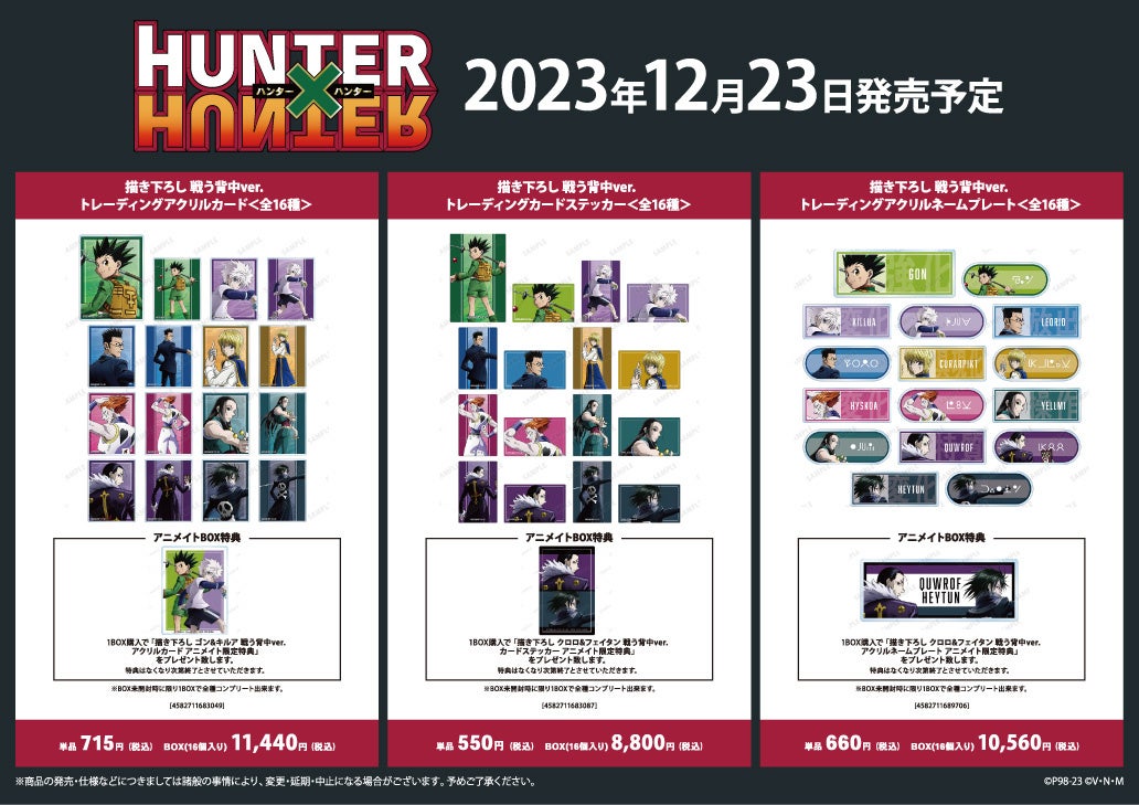 また、フェア期間中にTVアニメ『HUNTER×HUNTER』関連のキャラクターグッズを購入または予約すると、予約内金1,100円(税込)ごとに特典の「ポストカード」がプレゼントされます。