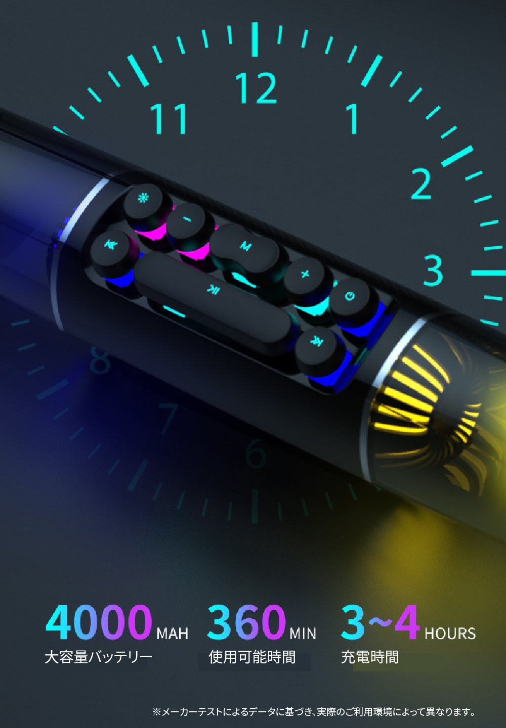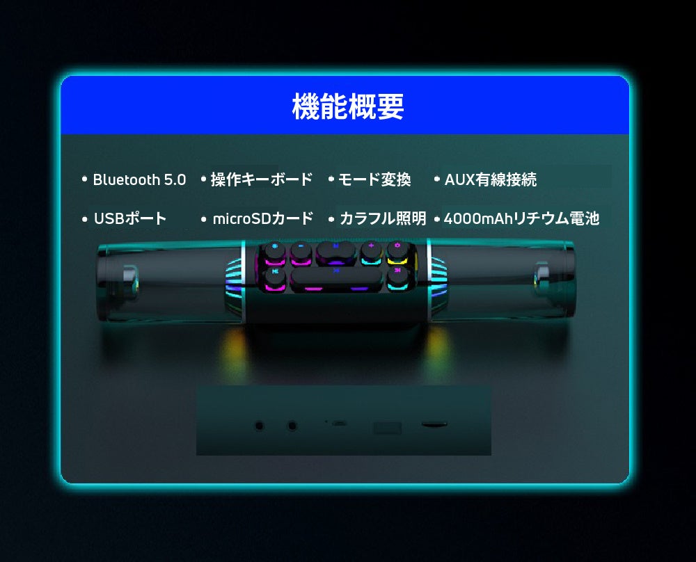 - 美しい照明効果と音質で、ゲームや音楽再生に最適なポータブルスピーカー。4000mAhバッテリー搭載で、約6時間連続再生可能。サイズは約370×79×66mm、重さは約800gで機能的な設計