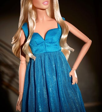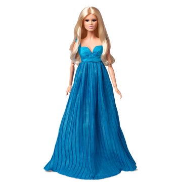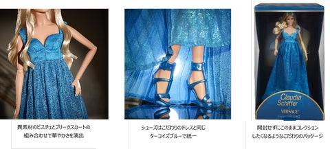 このバービードールは、1994年のアトリエ・ヴェルサーチ秋冬コレクションショーでクラウディア・シファーが着用したドレスをイメージしており、ヴェルサーチの象徴であるコルセットからインスピレーションを受けたビスチェとセミシアーなシフォンのプリーツスカートが特徴です。