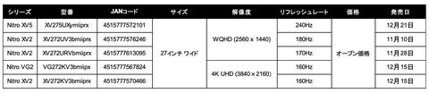 - 27インチ、WQHD、4K、XV272URVbmiiprx、XV272UV3bmiiprx