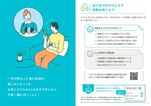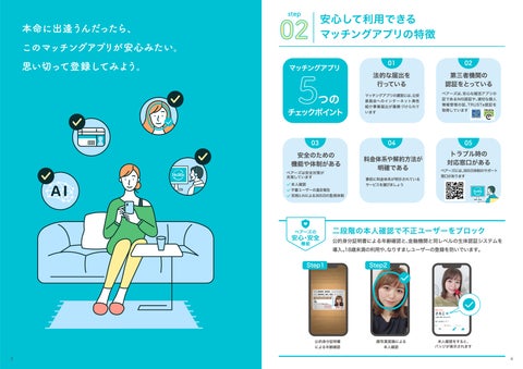 ハンドブックでは、マッチングアプリの使い方や注意点、安心・安全機能についてイラストを使ってわかりやすく解説しています。