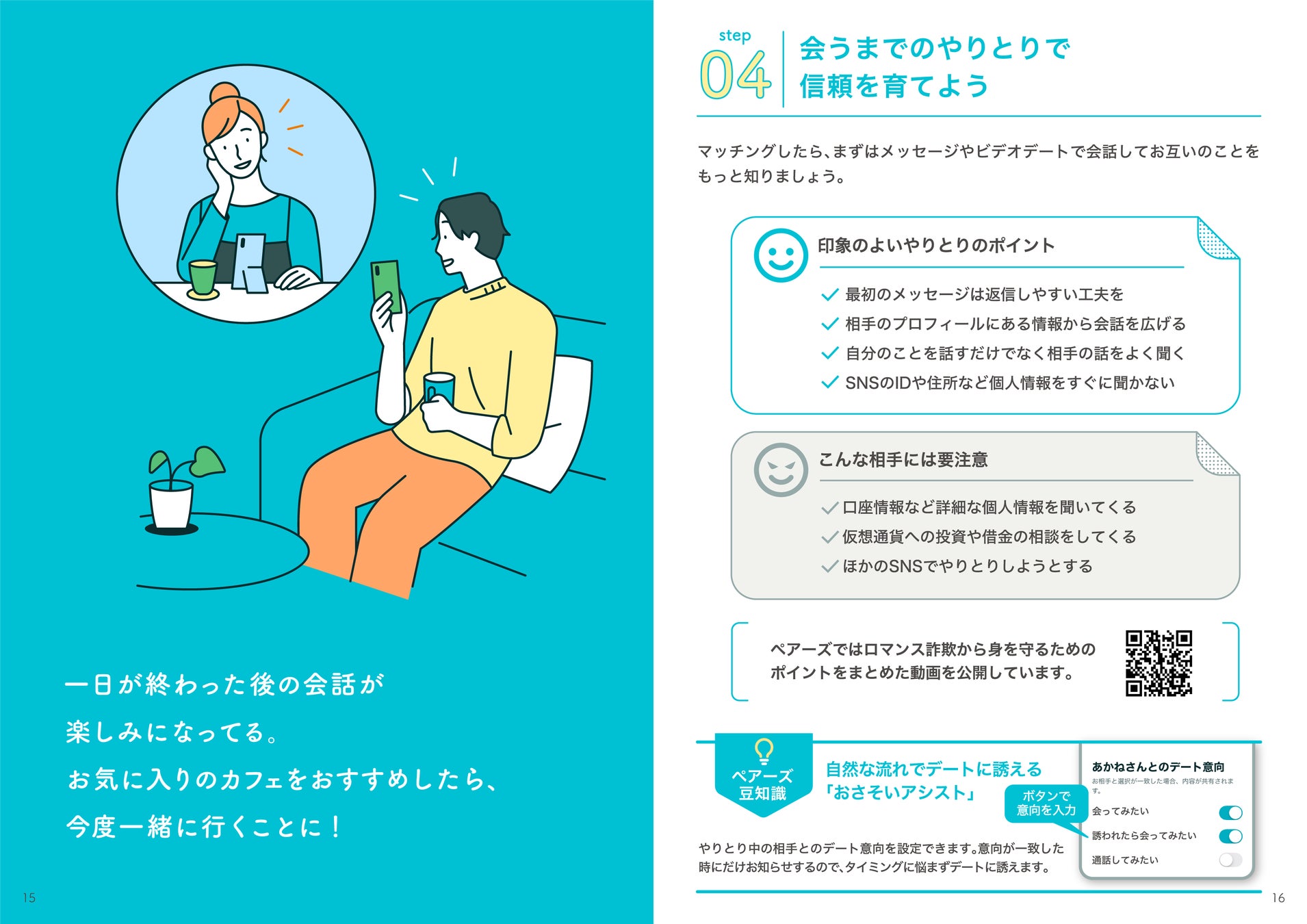 現在、マッチングアプリが一般的な出会いの手段となっている中、ペアーズは初めてマッチングアプリを利用する方々に安心・安全に始めるための情報を提供するためにハンドブックを作成しました。