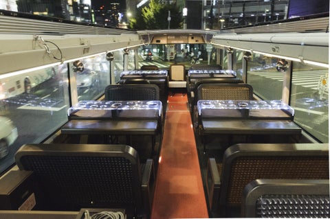 - レストランバス車内で和食コース料理やお酒を楽しみながら、観光スポットや夜景を眺めることができます。