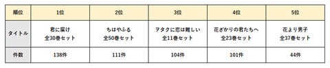 - 少女マンガ部門の1位は「君に届け 全30巻セット」で138件の買取件数。