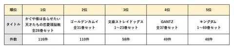 - 青年マンガ部門の1位は「かぐや様は告らせたい~天才たちの恋愛頭脳戦~ 全28巻セット」で116件の買取件数。