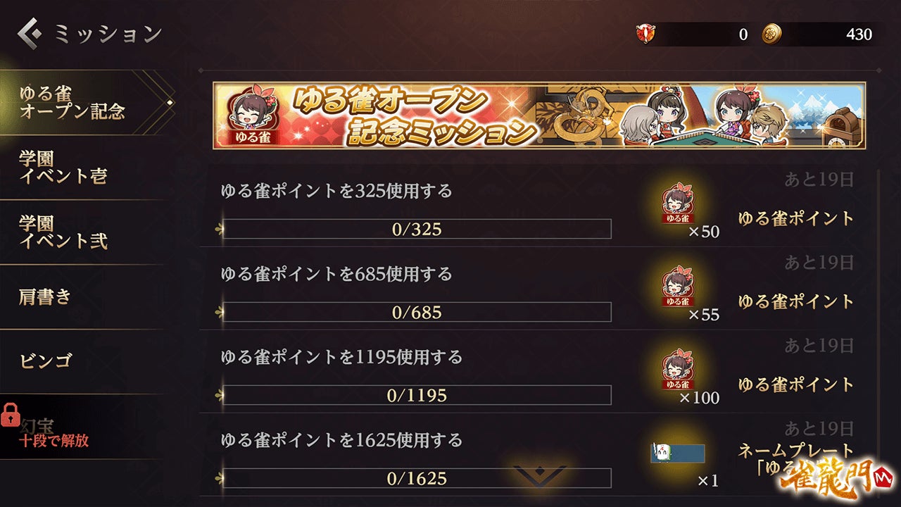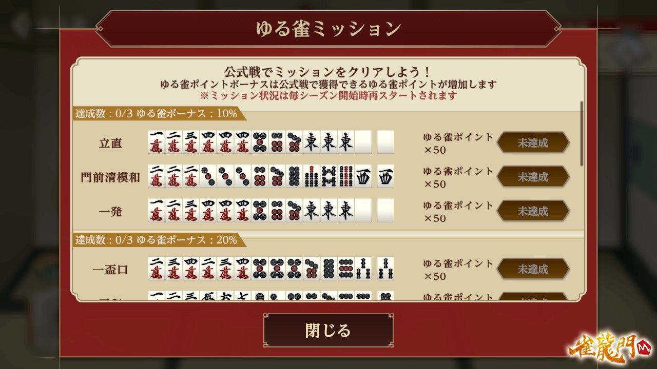 さらに、一定数のミッションをクリアすると、公式戦で獲得できる「ゆる雀ポイント」が増加する「ゆる雀ポイントボーナス」が発動します。