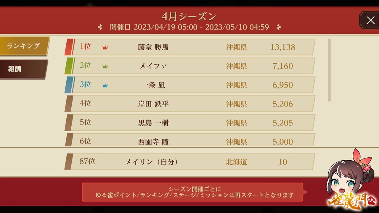 シーズン開催期間中に使用した「ゆる雀ポイント」の数でランキングが決まり、上位入賞者は豪華な報酬を獲得することができます。