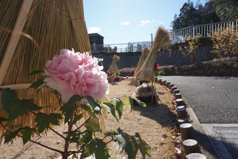 この展示では、春に咲く品種のぼたんを真冬に開花させ、雪ん子のような藁ぼっちで飾ります。