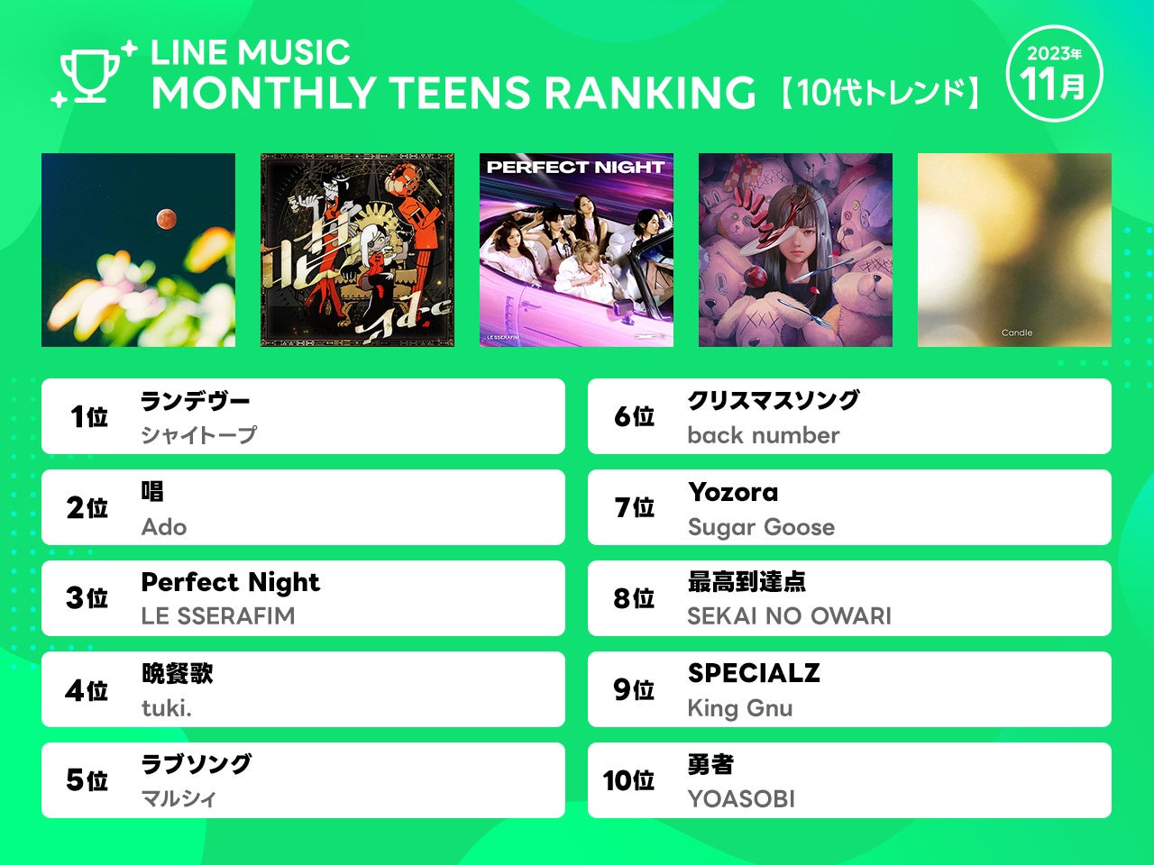 【LINE MUSIC 11月月間ランキング】ハロウィンから再燃焼!総合1位 Ado「唱」、10代トレンドランキング1位シャイトープ「ランデヴー」