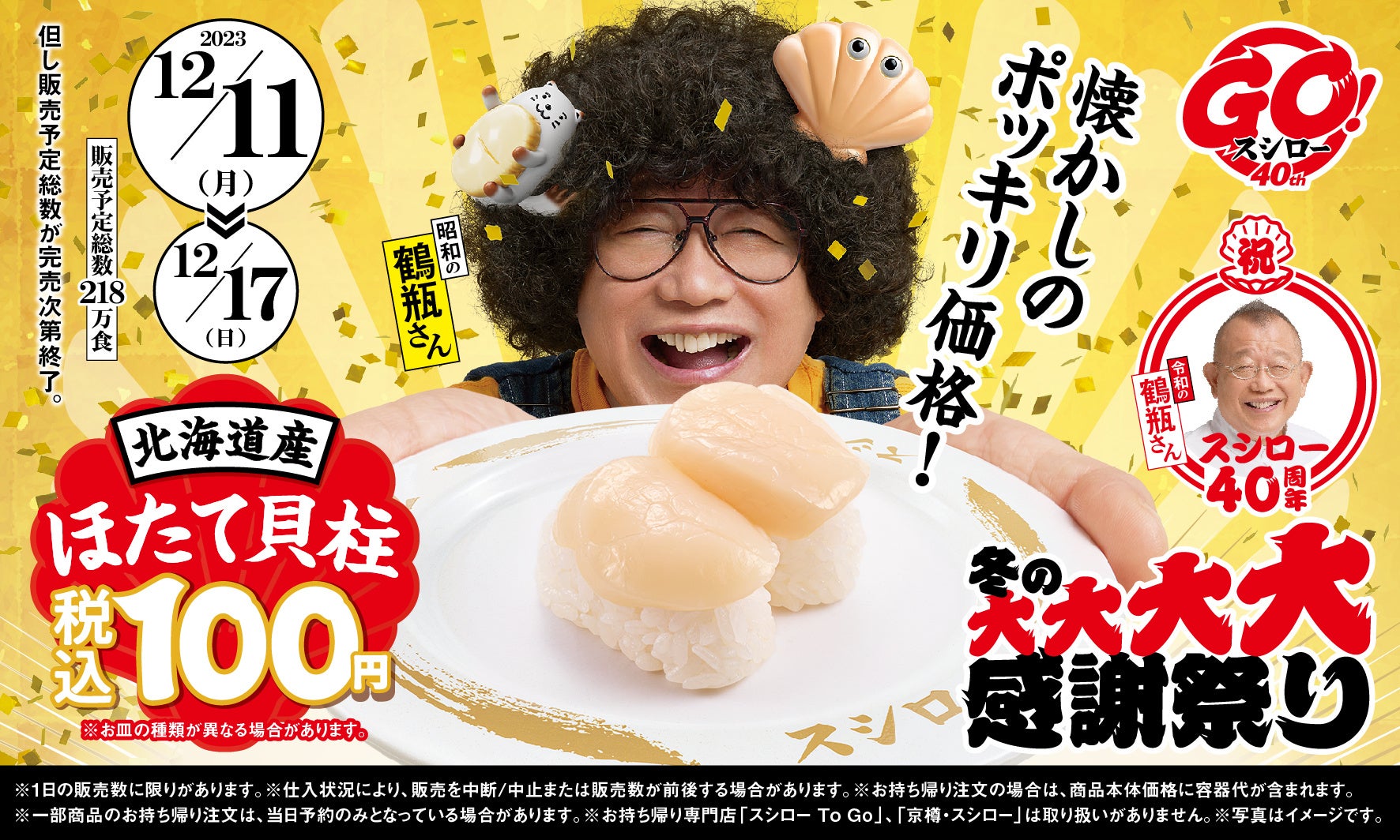 - 最新のメニューには北海道産ほたて貝柱が加わり、全店で100円で提供
