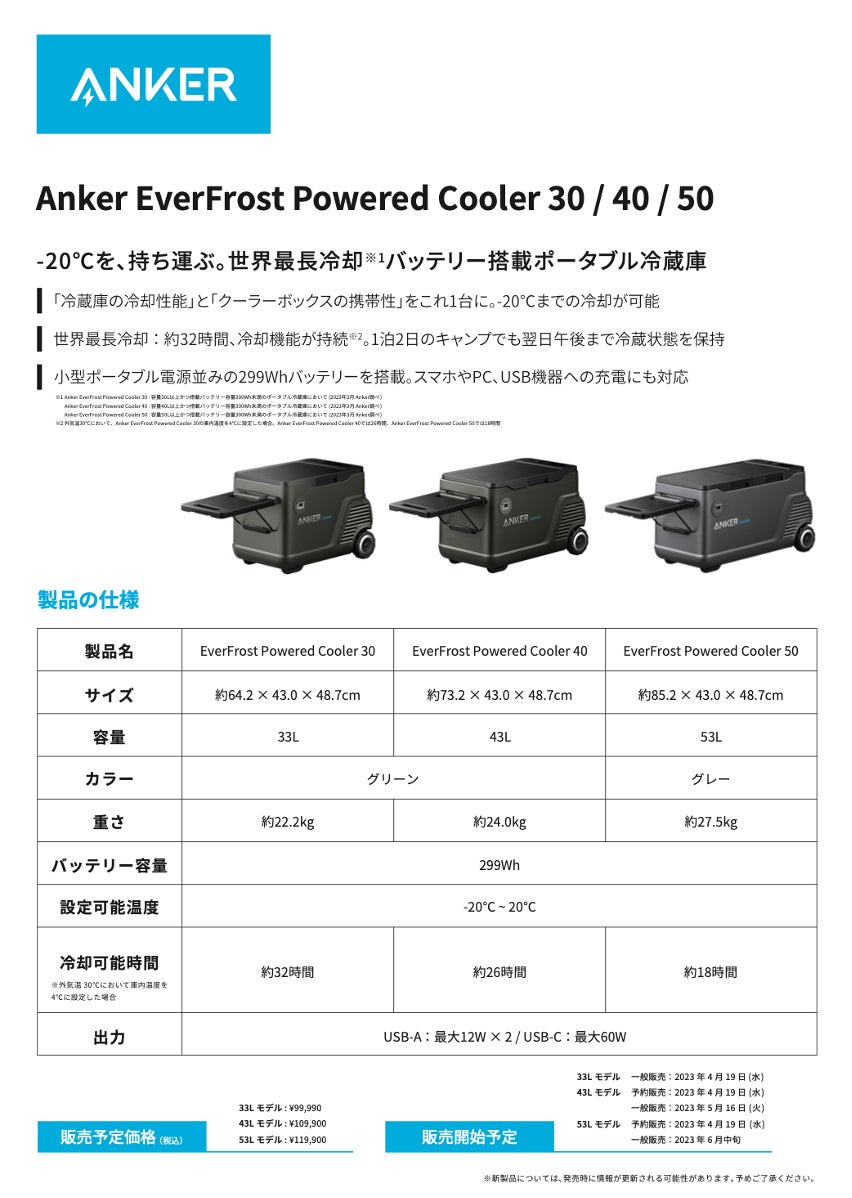 Ankerが、バッテリー搭載ポータブル冷蔵庫「Anker EverFrost Powered Cooler 30 / 40 / 50」を2023年4月19日より販売開始する。