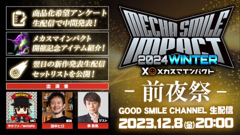 前夜祭では前回のイベント振り返りや商品化アンケートの中間発表、イベント開催記念アイテムの紹介、そして『メカスマインパクト2024 WINTER』のセットリスト発表が行われます。