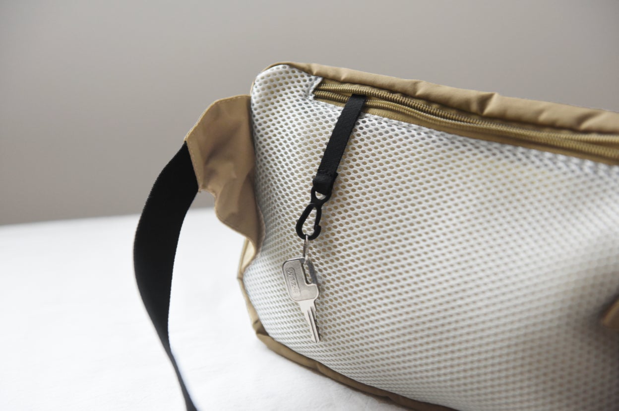 - 背面ポケットにはキーフックが付属し、鍵の紛失を防ぐ