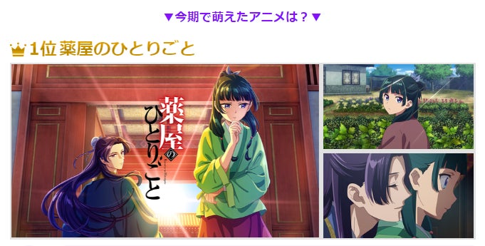 萌える作品では「薬屋のひとりごと」が1位で、主人公の猫猫役の悠木碧さんの演技やキャラクターの魅力が評価されています。
