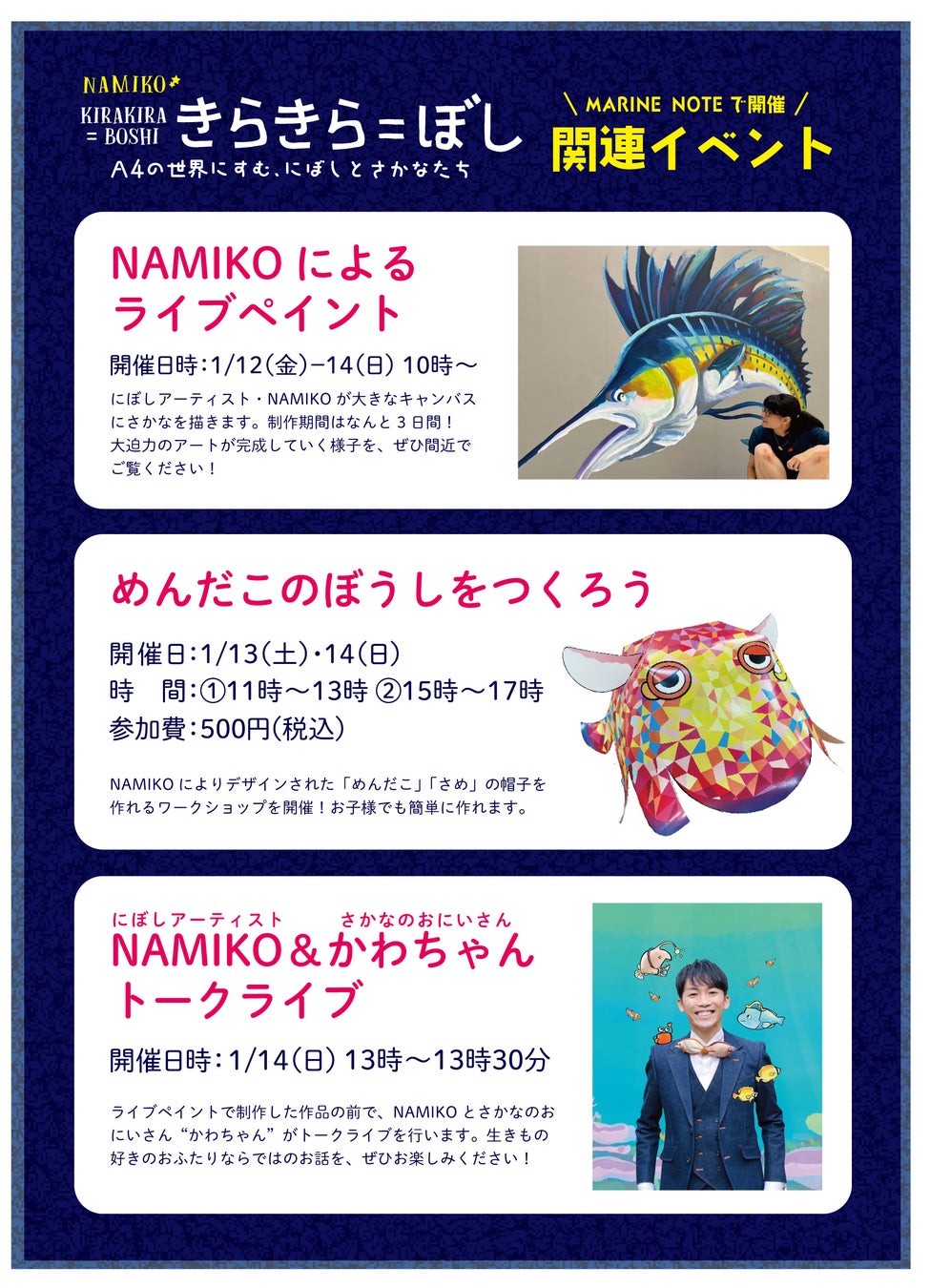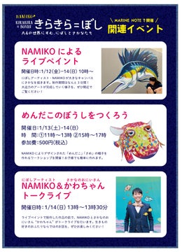 関連イベントでは、NAMIKOによるライブペイントや親子で楽しめるワークショップ、NAMIKOとさかなのおにいさん“かわちゃん”のトークライブも行われます。