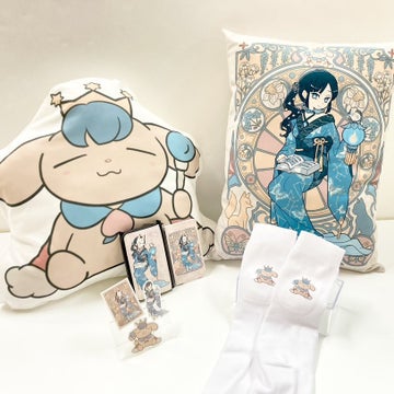 - 商品ラインナップにはクッション、モバイルバッテリー、コインパースケース、靴下、マグカップ、ステッカーがある