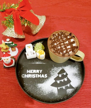 - クリスマスメニュー、トナカイぱんケーキ、ホットチョコレート