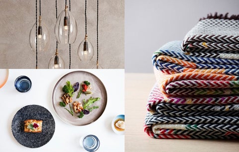 - 先行発売のソファやダイニングシリーズ、ノルウェジアンアイコンズのブランケットや食器照明などが並ぶ