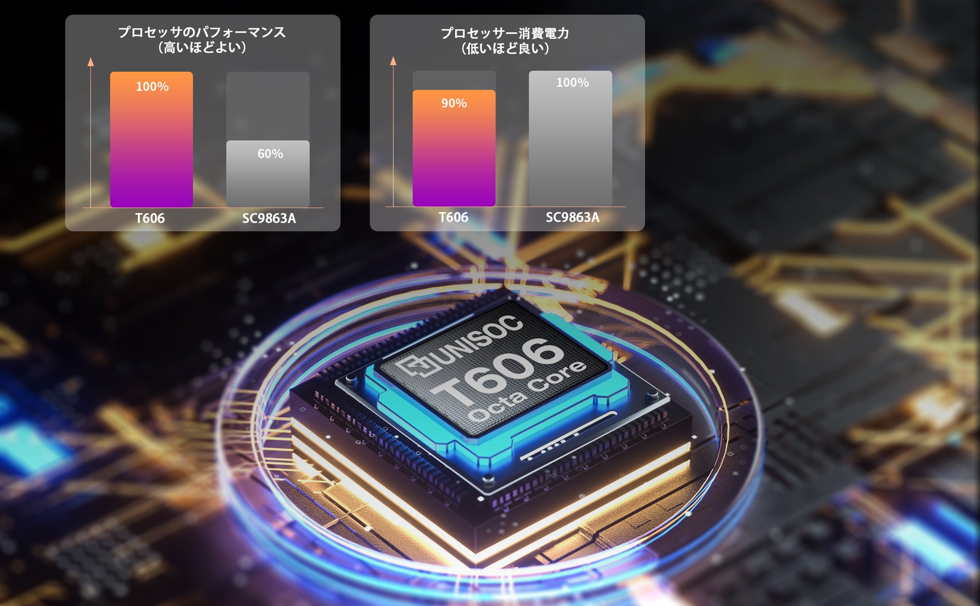 また、高性能なUnisoc T606を搭載しており、8コアCPUで最大周波数2.0Ghz対応しています。