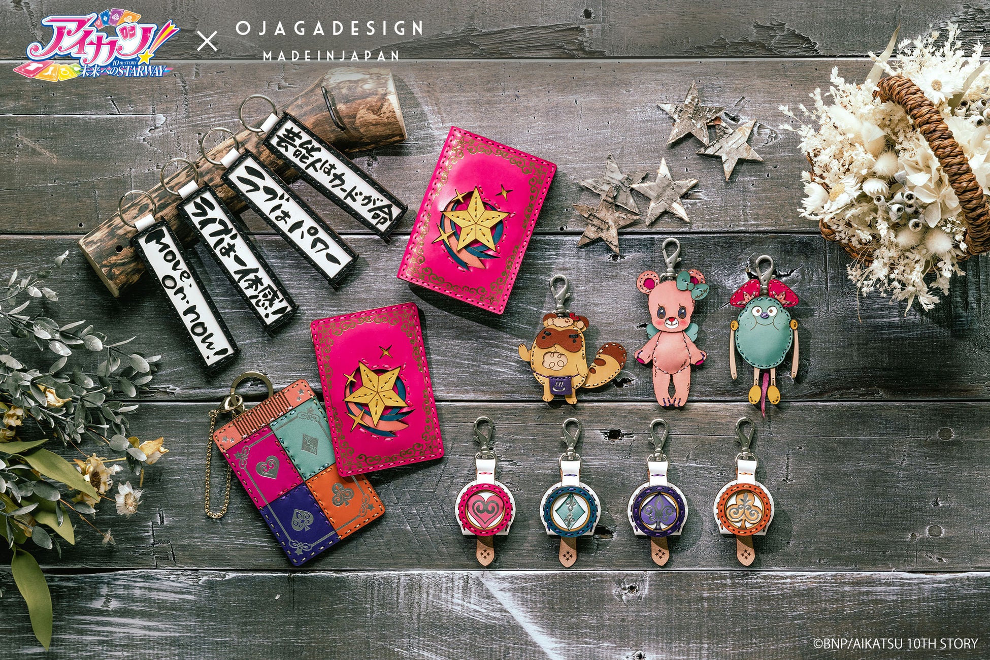 「アイカツ!」のアイドルたちが通う「スターライト学園」の校章をモチーフにしたマルチケースや、「アイカツ!カード」をモチーフにしたパスケースなど、細部までこだわったハンドメイドのアイドルグッズが登場しました。