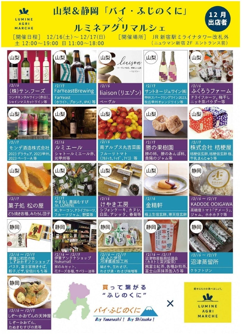 この取り組みの一環として、両県の農林水産品や加工品を首都圏で広くPRし、認知度向上と販路拡大を図るため、12月16日(土)と17日(日)の2日間、JR新宿駅ミライナタワー改札外で山梨&静岡「バイ・ふじのくに」×ルミネアグリマルシェを開催します。
