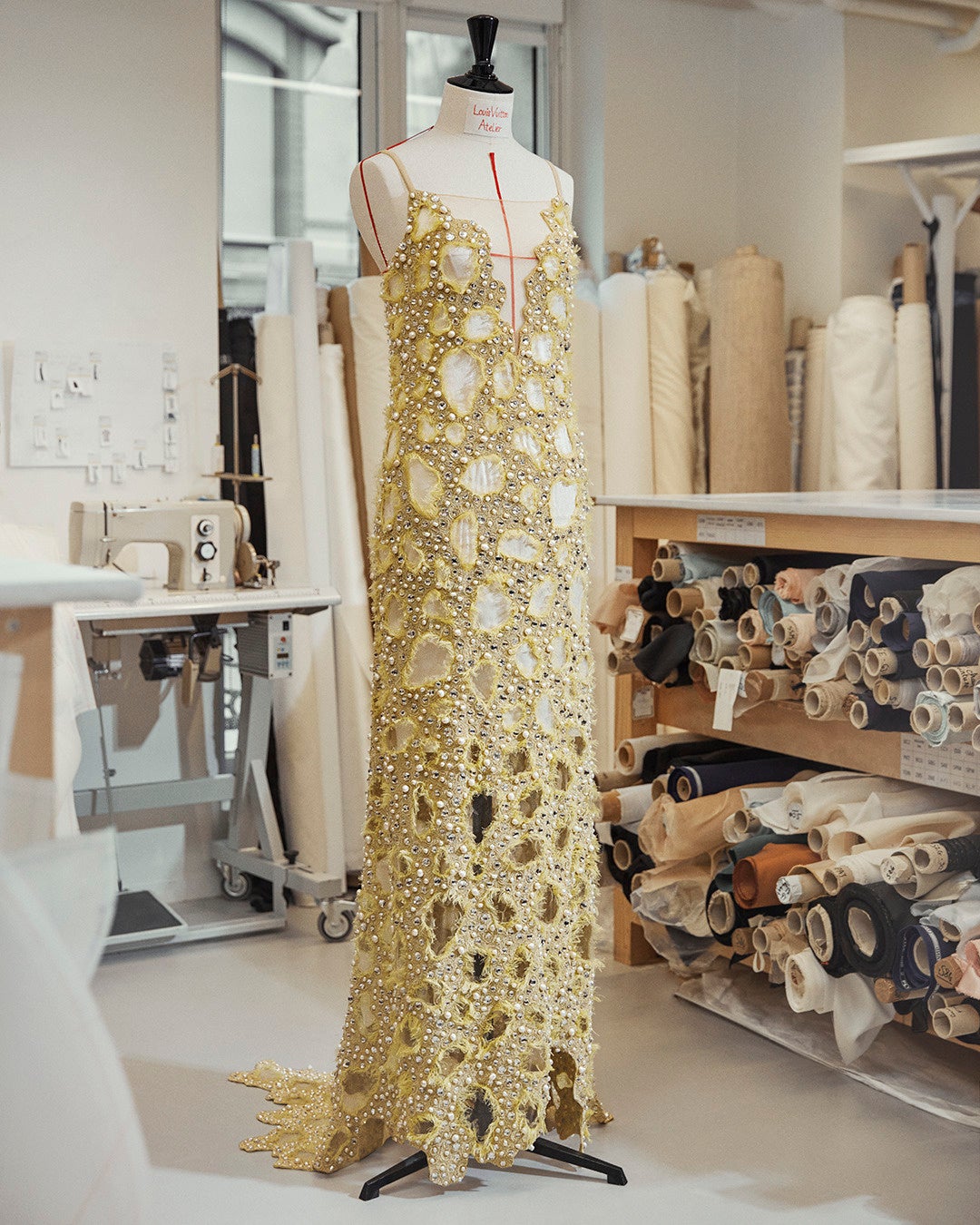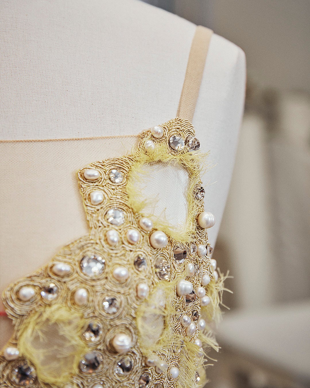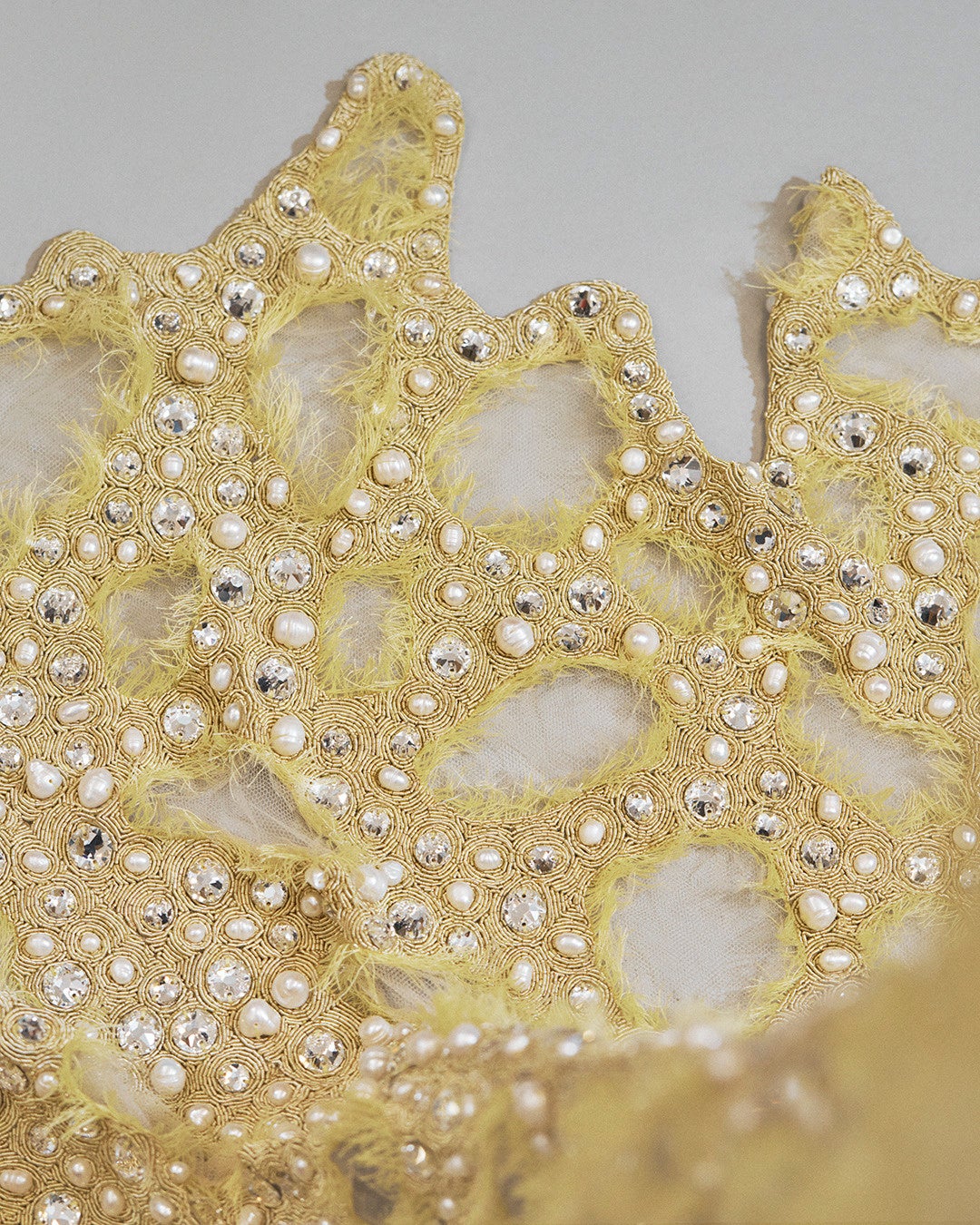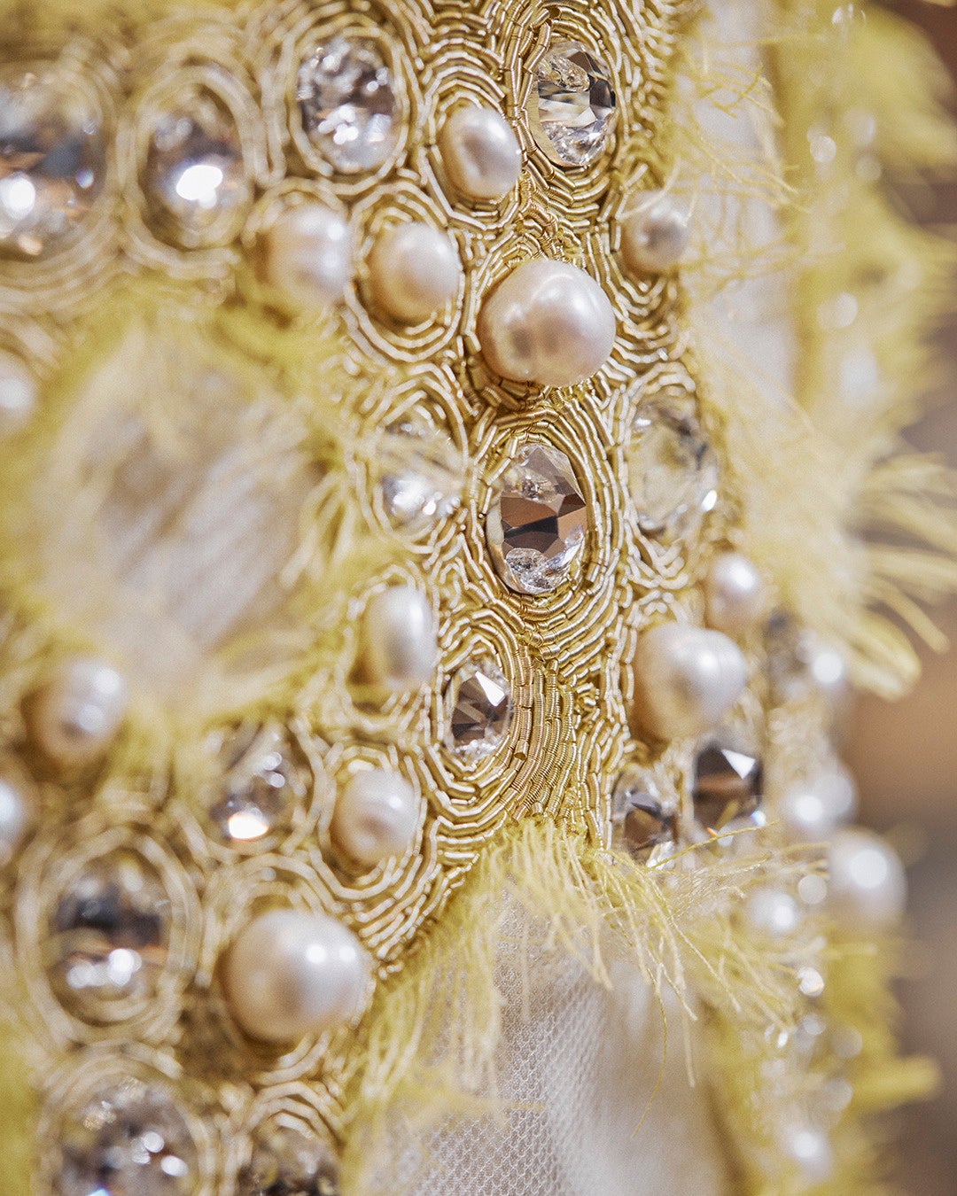 • ドレスは刺繍チュールで、クリスタルとマザーオブパールが施されている