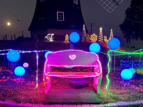 公園の風車前広場で、こたつ席やテント席で暖を取りながら、イルミネーションやキャンプファイヤーを楽しむことができます。