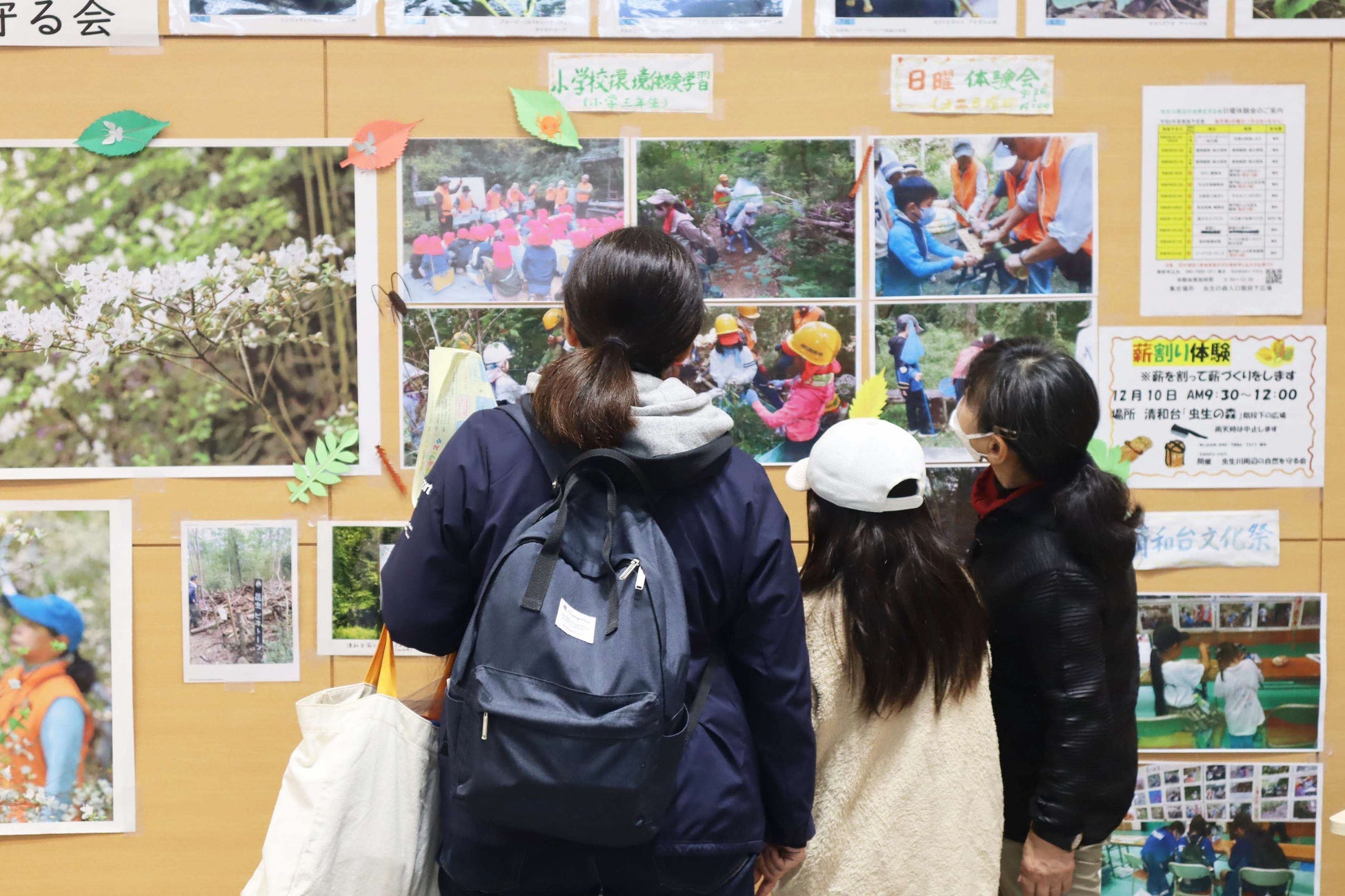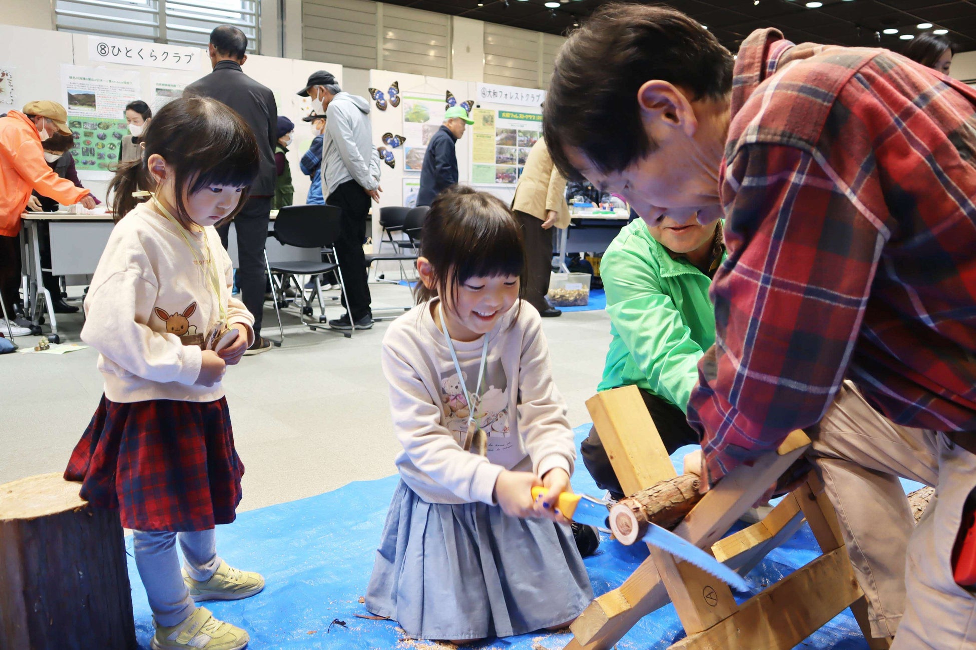 会場では、25団体が自然活動や環境に関するブースを展開し、葉っぱや木を使った工作やクイズ、手回し発電機の体験、オオムラサキの写真展示などが行われました。