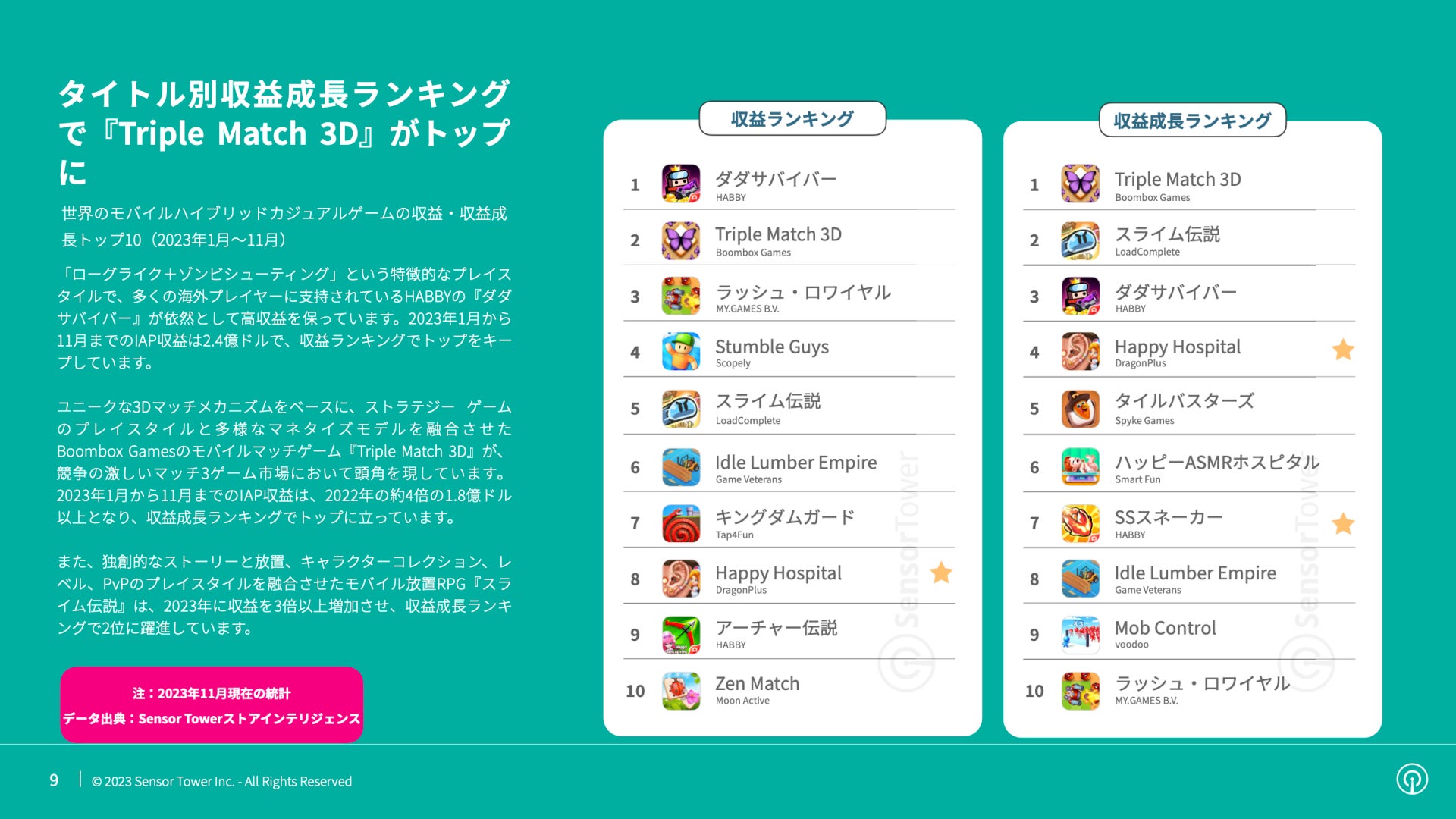 - 収益成長ランキングでは『Triple Match 3D』がトップ
