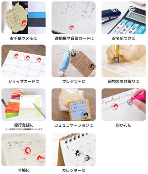 121種類のキャラクターのイラストと3種類のフォントから選ぶことができ、セルフインクタイプや木彫りタイプ、黒水牛タイプなどのバリエーションもあります。