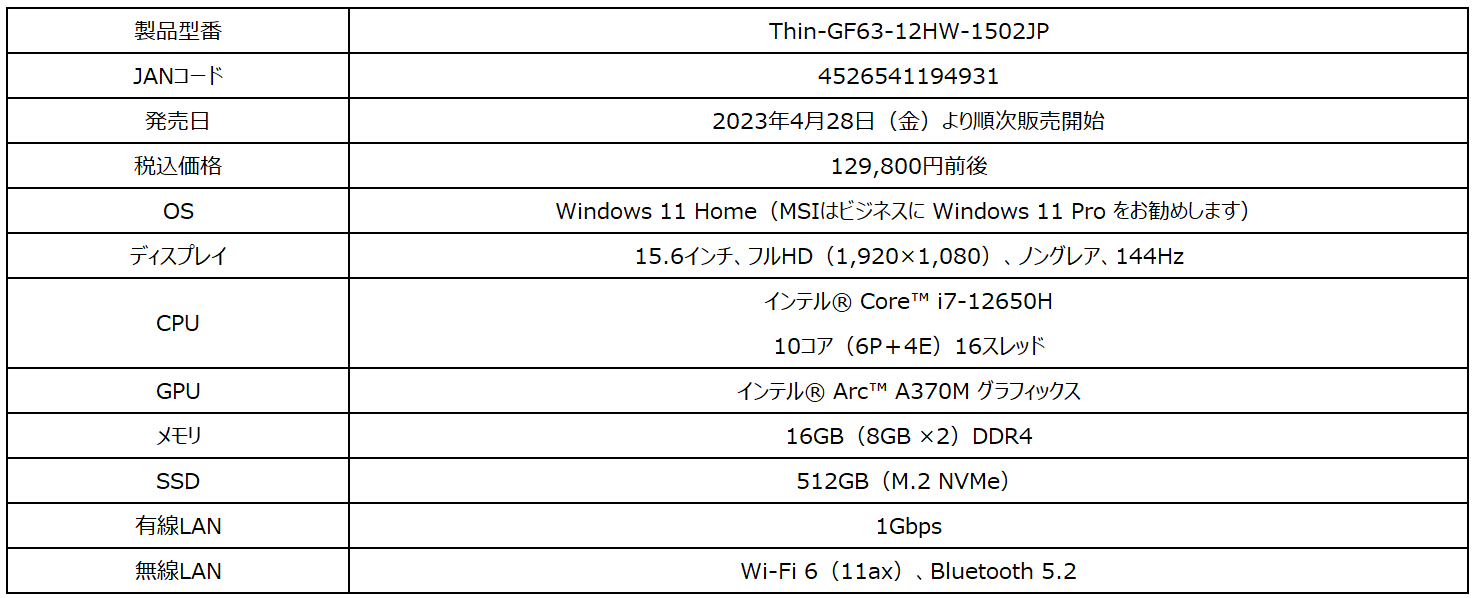 Thin-GF63-12HW-1502JPは、インテル® Arc™ A370M グラフィックスを採用し、ライトゲーマー向けに高いコストパフォーマンスを実現。