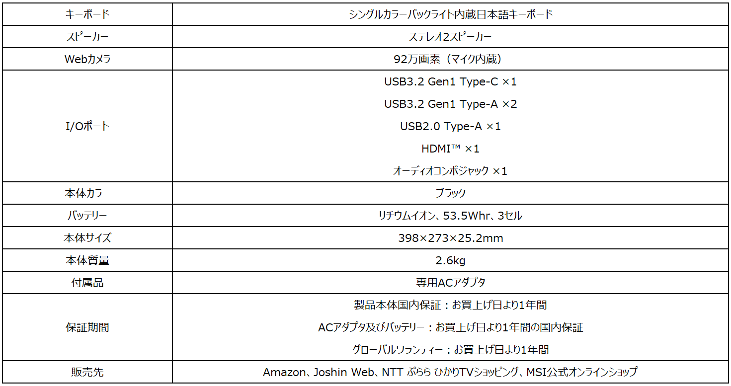 また、MSIノートPC初の「インテル® Arc™ グラフィックス」を採用したゲーミングノートPC「Thin-GF63-12HW-1502JP」や、15万円以下の価格で「GeForce RTX™ 3060 Laptop GPU」を搭載した「Katana-GF76-11UE-1802JP」も発売される。