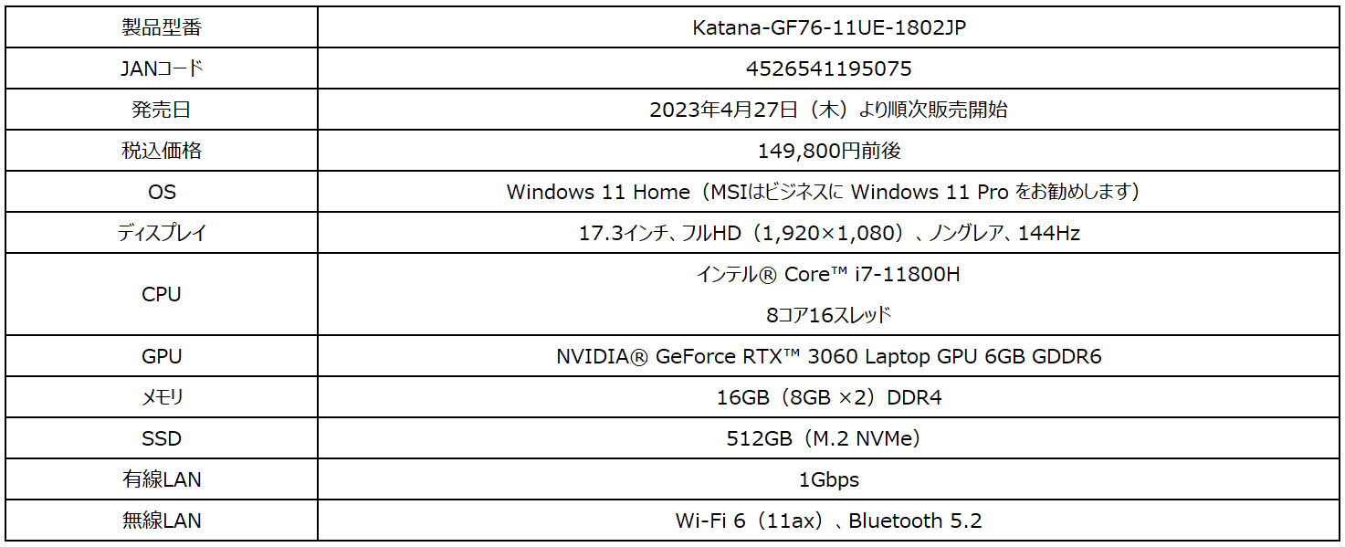 - 「ThinGF6312HW1502JP」と「KatanaGF7611UE1802JP」も発売され、それぞれインテル® Arc™ グラフィックスや「GeForce RTX™ 3060 Laptop GPU」を搭載