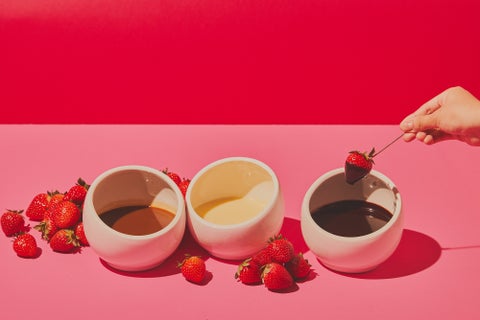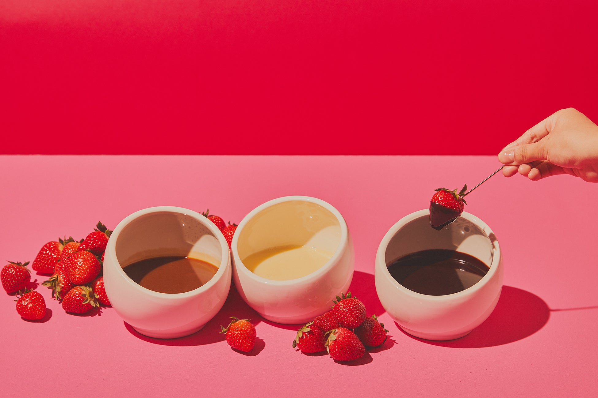 • ブランドいちごの食べ比べもあり、ディップソースとしてチョコレートソースと練乳が用意されている