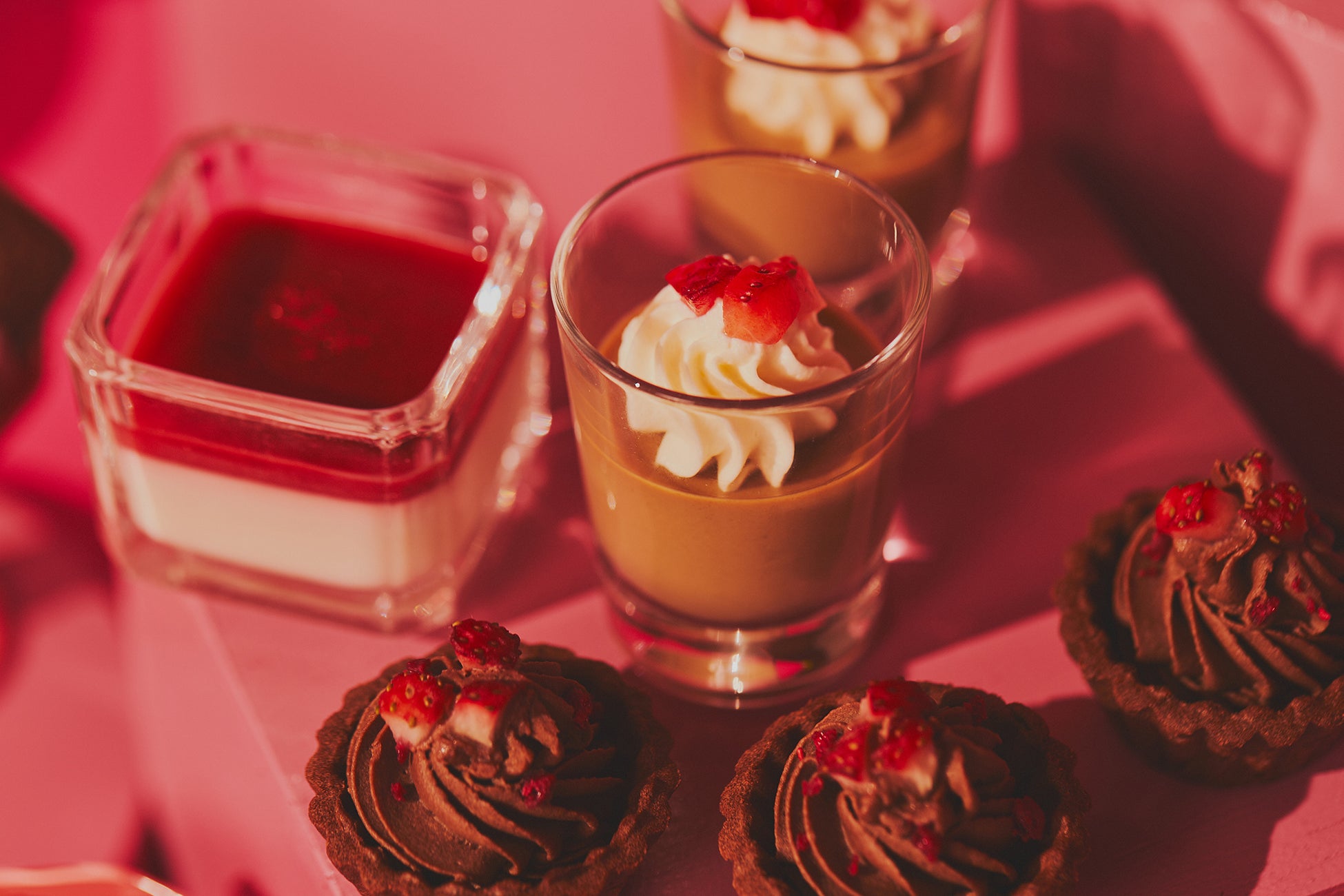 また、いちごのスパークリングゼリーやいちごパンナコッタなどのグラススイーツ、いちごブッセやチョコタルト、いちごのシュークリームなどの焼き菓子も楽しめます。